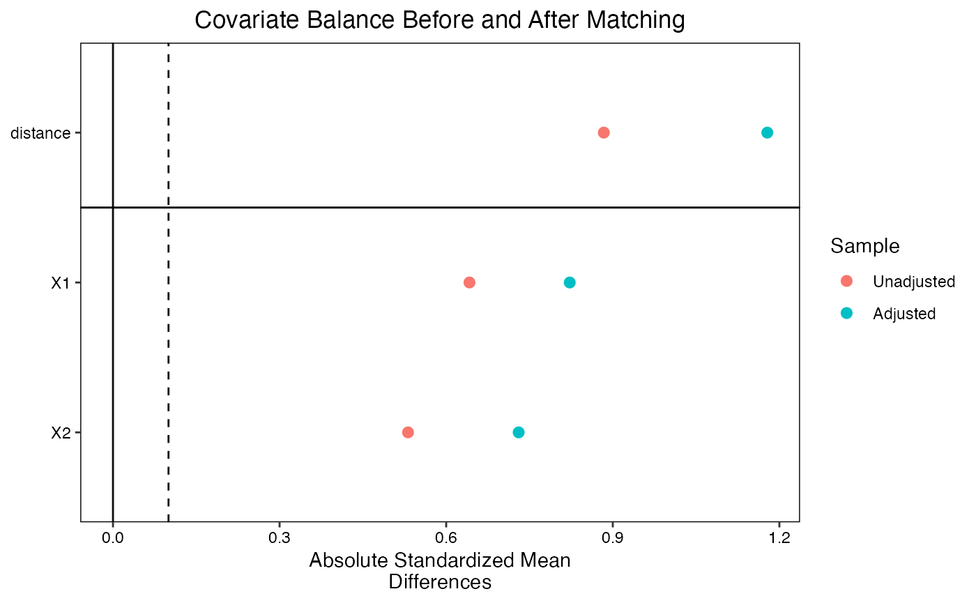 ## matchit(formula = W ~ X1 + X2, data = data, method = "nearest",